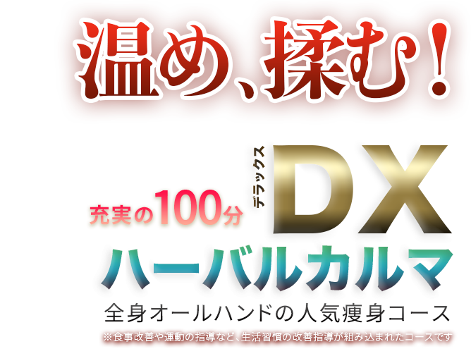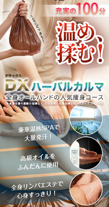 人類は太古の昔から植物を利用して心身にアプローチしてきました。 ハーブや植物のエキスが様々なケアに役立てられてきた中で、とくに美容に最大限に活かしたのが、エイチ・ツー・オー渾身の痩身リンパエステ、人気のDXハーバルカルマコースです。 ハーバルラップや遠赤外線ヒートマットでじんわりと温まり、トリートメントによって身体の隅々まで届け、そのまま老廃物をリンパから押し流すようにケアします。